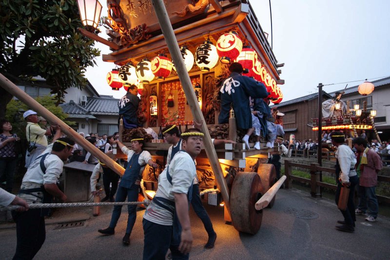 曲がり角の塀に貼り付いて10ミリ(35ミリ換算16ミリ)の広角で撮影。曳き手はほとんどレンズに触れそうなところを通りますので迫力満点。