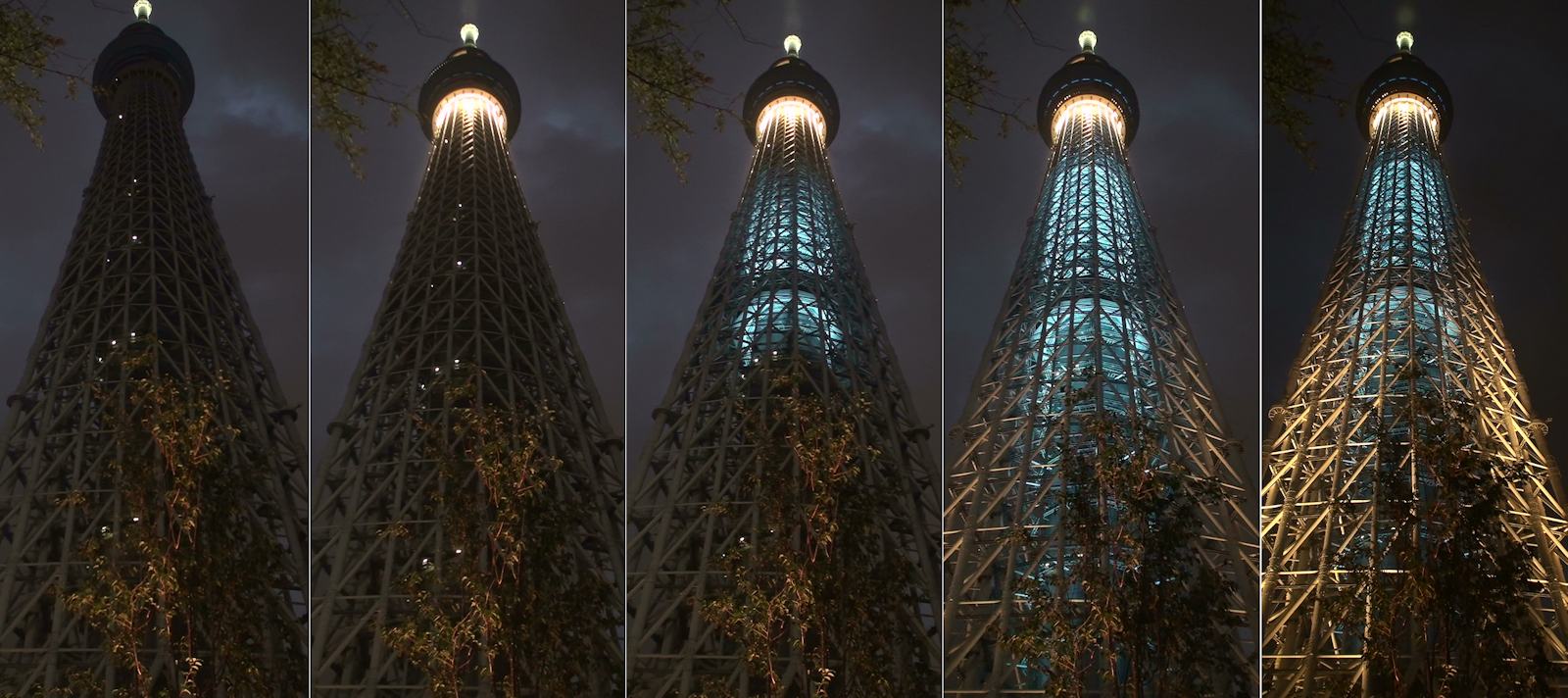 点灯の瞬間。まず先端から明るくなります。フルライトアップになるまで約30秒。思ったより速かったです